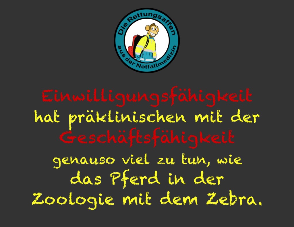 Wir hatten uns zwar in diesen Beiträgen bereits der Problemstellung gewidmet und wollen diese nun nicht nochmals in ihrer kompletten Breite ausbreiten, sondern wollen lediglich die Problematik „Geschäftsfähigkeit“ und „Einwilligungsfähigkeit“ noch einmal schlaglichtartig beleuchten. Denn hierbei handelt es sich um eine im Prinzip einfache, aber gleichwohl äußerst wichtige Unterscheidung, zumindest was die Präklinik anbelangt..