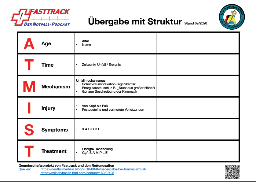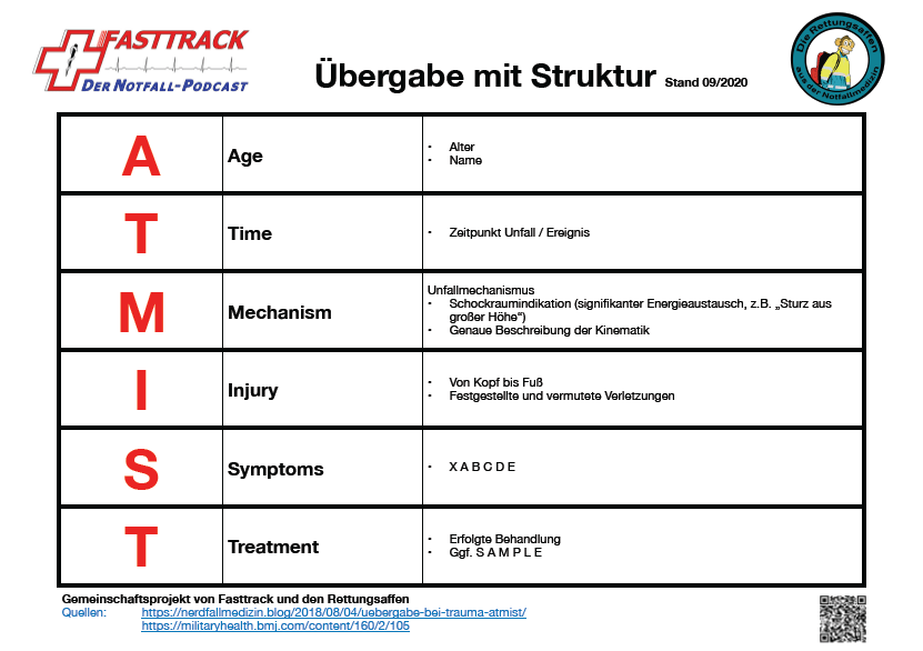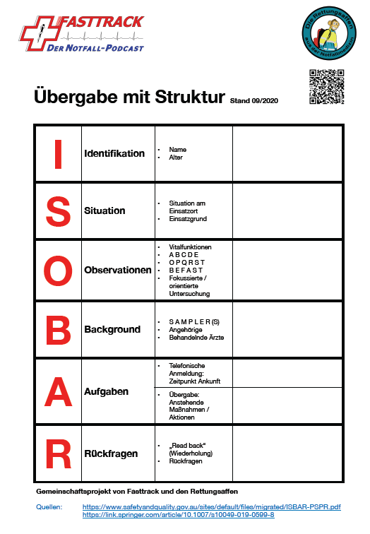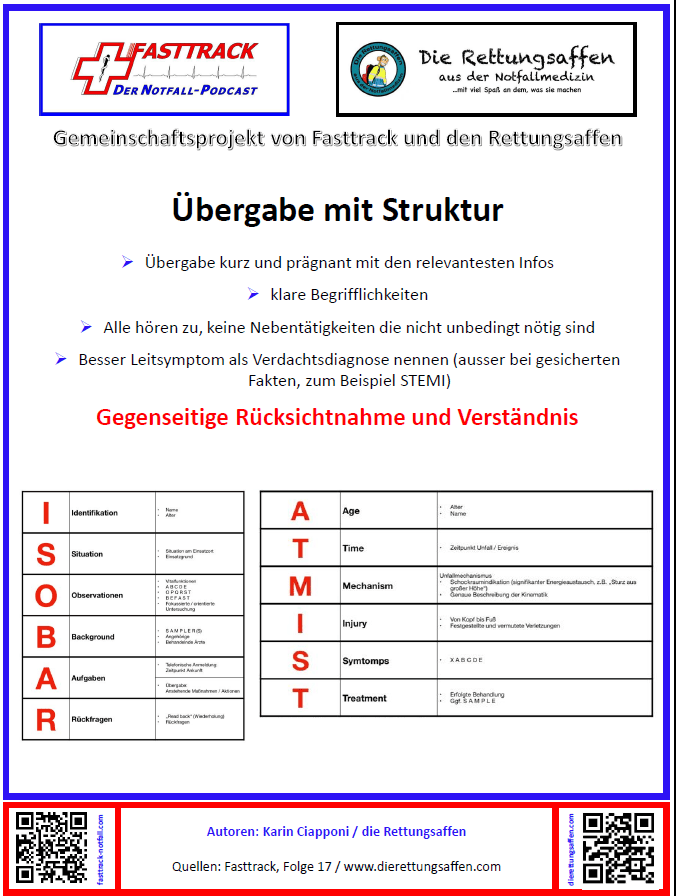 In einem Gemeinschaftsprojekt mit den Kollegen von Fasttrack-der-Notfallpodcast habe wir uns in einem Podcast über zwei mögliche Schemata, nämlich ISOBAR und ATMIST unterhalten, wobei wir natürlich auch kurz noch einmal auf das ABCDE – Schema eingehen. Klar war für uns von Beginn aber auch, dass diese Hilfen nicht nur dann als „Richtschnur“ genutzt werden können, wenn der Rettungsdienst einen Patienten ins Krankenhaus bringt, sondern immer auch dann, wenn ein Patient aus dem Krankenhaus entlassen oder in ein anderes verlegt werden muss; ob nun als „normaler Krankentransport“, als „eilige Notfallverlegung“, oder als geplanter Intensivtransport.