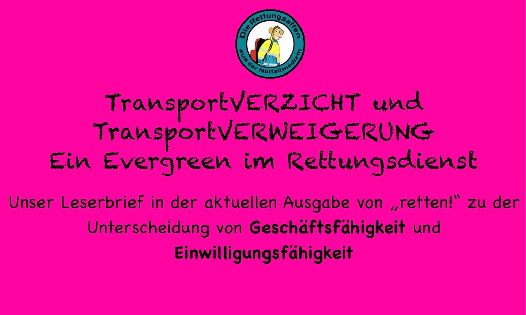 Schon länger begleitet uns, die Rettungsaffen, die Thematik des Transportverzichts (der Patient möchte gerne mit dem RTW ins Krankenhaus gefahren werden, obgleich keine Notfallindikation vorliegt) und die der Transportverweigerung (wir sind zwar der Auffassung, dass eine Transportindikation besteht, der Patient will aber nicht mit).
