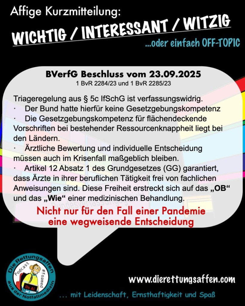 Hinweis von uns zu der Anmerkung des BVerfG: Diese sollte jetzt aber nicht zu Panik führen. Ist es am Einsatzort unklar, was der Patient wünscht, bzw. wirksam verfügt hat, gilt im Zweifel für das Leben. Klar sollte jedoch sein, dass der Patientenwille stets ein hohes Gut ist.